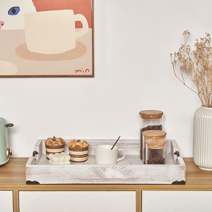 - High quality pine wood: Unlike others, our trays are crafted with only solid pine wood, Never fir or paulownia. Our kitchen serving tray is stronger, durable and long lasting. Our rectangle vintage rustic serving tray with shabby whitewashed, it is a very retro and beautiful decoration. Please allow the color maybe variance due to handmade painting