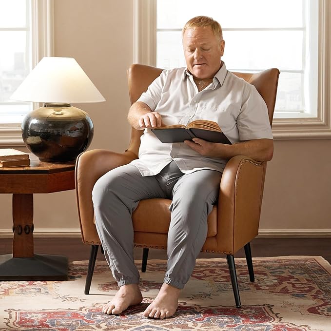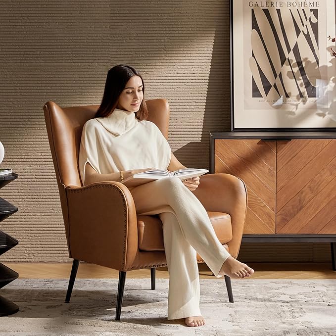 - Unique Living Room Chair - This armchair is made of vegan leather, adding a touch of elegant and vintage sense to your living room or bedroom. With the retro backrest, metal tapered legs in a black finish, and nailhead trim, our wingback side chair could be a focal point in your room. This armchair is ideal for diving into a wonderful book or talking with friends and family.