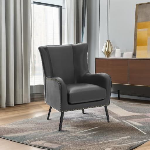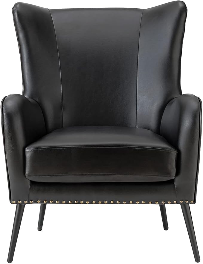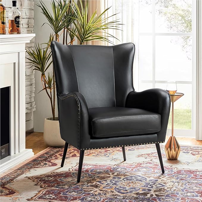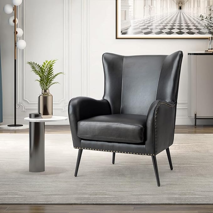 - Unique Living Room Chair - This armchair is made of vegan leather, adding a touch of elegant and vintage sense to your living room or bedroom. With the retro backrest, metal tapered legs in a black finish, and nailhead trim, our wingback side chair could be a focal point in your room. This armchair is ideal for diving into a wonderful book or talking with friends and family.