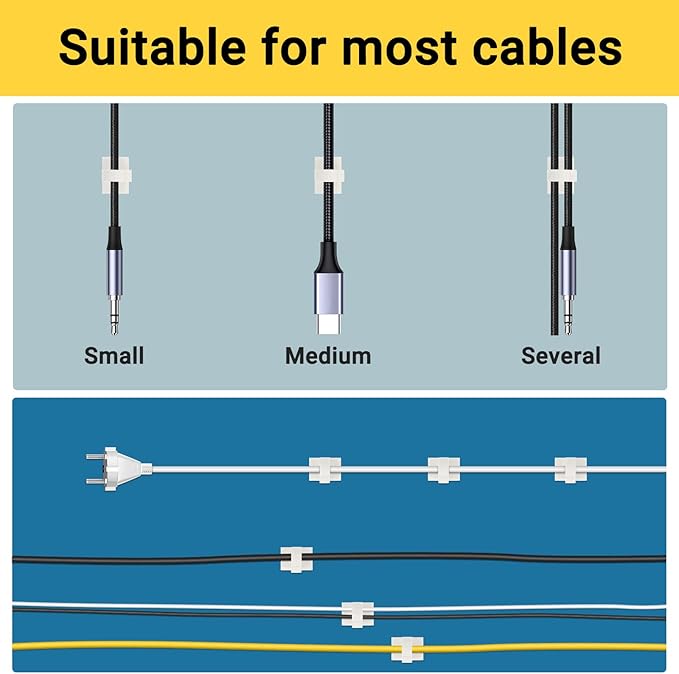 - Adhesive Wire Clips --- Made of Premium Plastic, our self adhering cable clips have higher strength and toughness, better wear resistance, either to hold thin or slightly thicker cords. Get unsightly cord tucked away, making your home or office a neat place. Especially the TV area where our cables are easily entangled and intertwined with each other as well as the desk area where our computer mouse cord gets messy frequently. The sticky wire holder is a good helper at arranging wires.