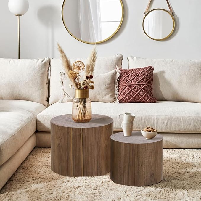 Round Coffee Table Set of 2, Nesting Coffee Table and End Table Set Wood Small Circle Drum Side Table for Living Room Office, No Assembly,Walnut
