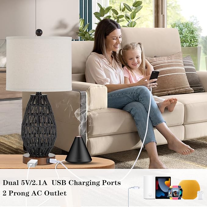 - 【Dual USB Charging Ports and AC Outlet】Are you bothered by the lack of charging ports when want to charge? The Built in Dual 5V/2.1A USB Charging Ports and 120V AC power outlet, allowing you to quickly charge 3 DEVICES at the same time, no worries about nowhere to charge your phones, tablets, speaker, etc. The charging function is available whether the rustic table lamp is on or off. Reduce the clutter of wall chargers or outlets while keeping your desk cleaner and tidier.