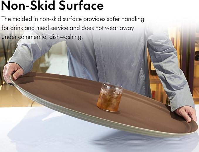 - Versatile Oval Shape - Ample 22" x 27" Black Non-Skid Oval Serving Tray. An industry standard for caterers, hotels, banquet halls, dining rooms, and bars.