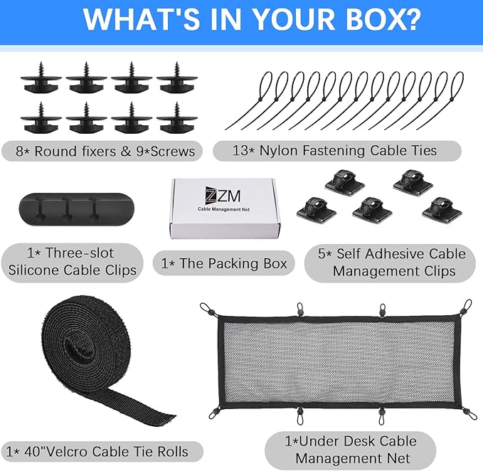 - 【ADJUSTABLE AND EASY TO INSTALL】Selectively enlarge the distance between each fixer to fit the desk snugly.Contains rolls of Velcro ties roll, nylon ties and multiple cable managers, etc. Perfect for organizing charging cables, power cables, network cables, audio cables, video cables and cable wires.