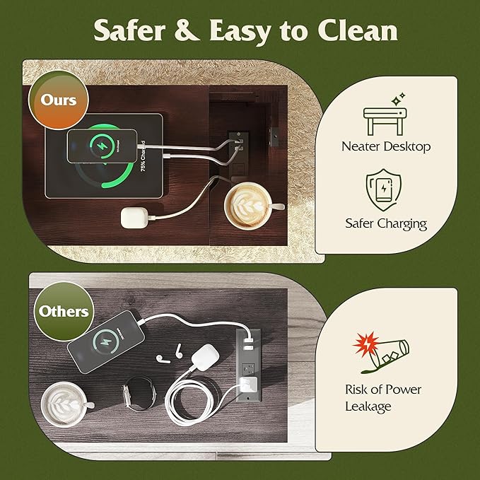 - 【Safer & Tidy】Unique hidden flip-top cover and built-in plug, so that it's no need to empty the desktop while using the plug. When charging the flip cover can be closed to prevent drinks from spilling on the table in direct contact with the plug, safer to use.