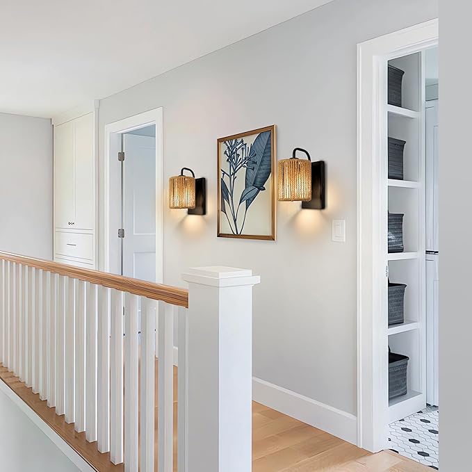 - [Rattan Style Hallway Wall Light] The boho light sconces usually have a unique style and design, which can become a highlight and decoration of a room. The rattan lamp sconce can provide unique lighting effects and create a charming atmosphere. The boho bathroom light fixtures can add warmth and comfort to the indoor environment and bring a natural atmosphere,make you feel like you're on a sunny beach