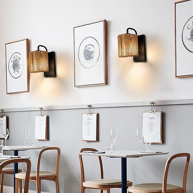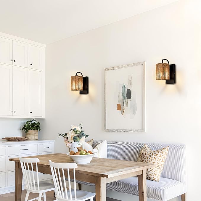 - [Wide Application] This rattan boho wall sconces is suitable for indoor use. The rattan light fixture can be used in your bedroom, headboard, living room, porch, entrance, garage, dining room, office, etc, and so on. These rustic and unique organic woven ropes, the wall lamps for living room combined with modern matte black backboard, integrated with modern minimalism and home decoration of rural farmhouses