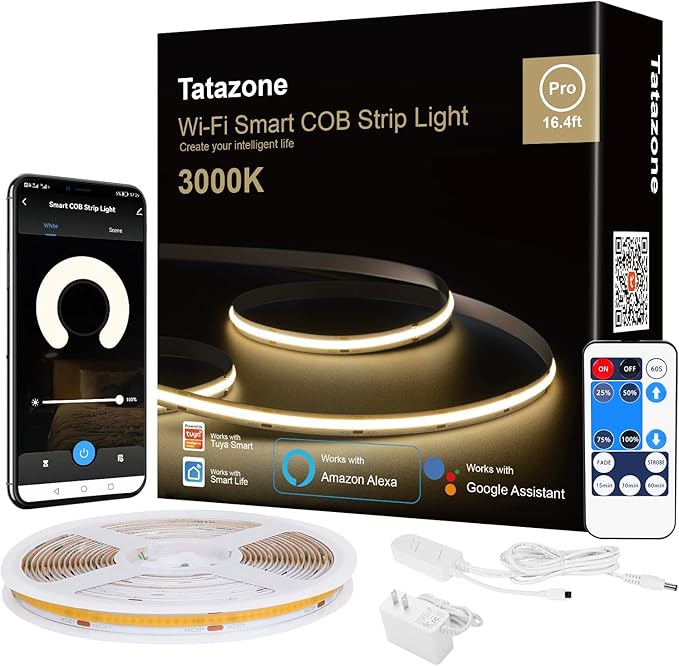 - Hands-Free Voice Control: TATAZONE smart cob led strip light kit for bedroom work with Alexa and Google Assistant. Turn on/off and adjust brightness with simple voice commands.