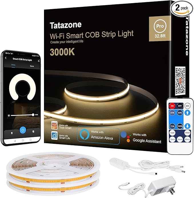 - Hands-Free Voice Control: TATAZONE smart cob led strip light kit for bedroom work with Alexa and Google Assistant. Turn on/off and adjust brightness with simple voice commands.