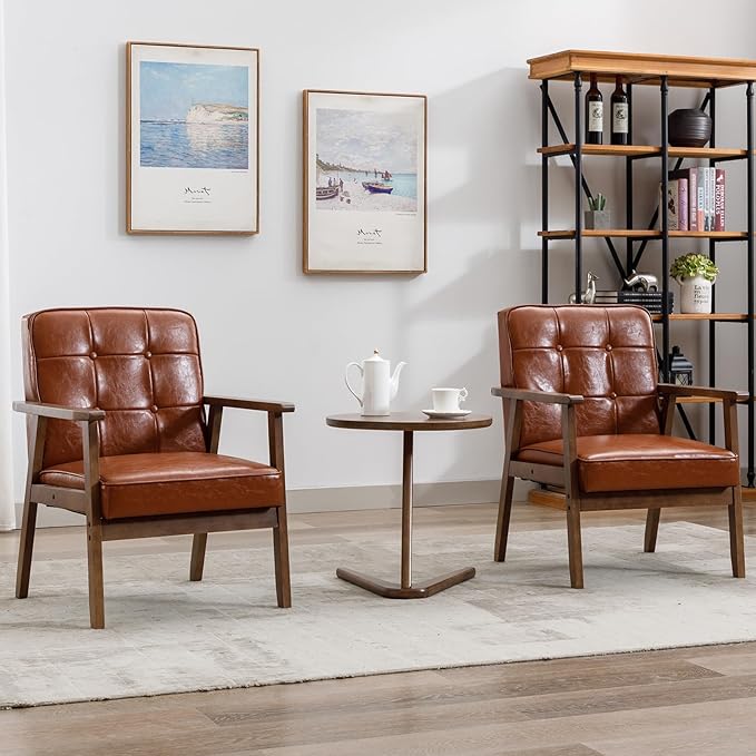 Okeysen Accent Chairs Set of 2, Mid Century Modern Accent Chair, Retro Wood and Leather Armchairs Side Chair, Lounge Reading Comfy Arm Chair for Living Room, Bedroom, Office(Brown)