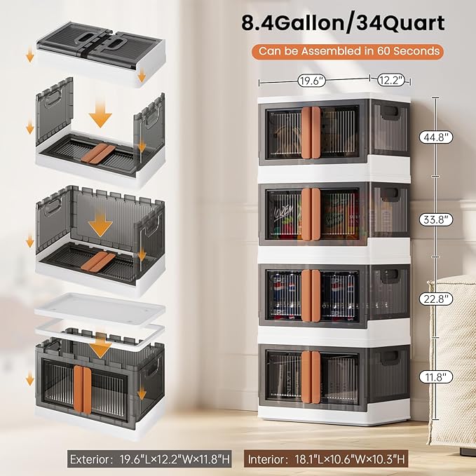 8.4Gal Collapsible Storage Bins with Lids & Wheels - 1 Pack Stackable with Doors, Heavy-Duty Plastic Containers for Home/Office, White