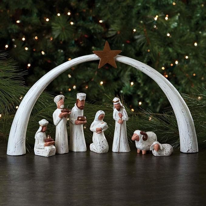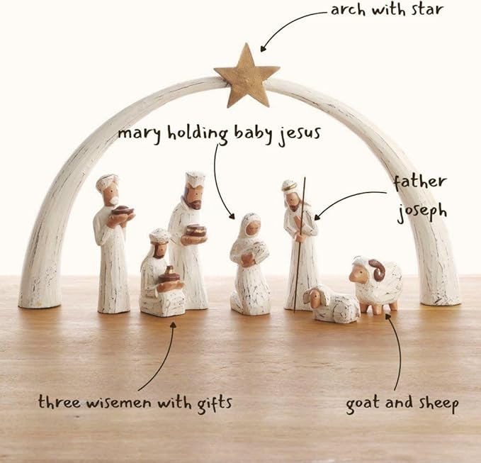- COMPLETE SET: Includes 8 carefully detailed pieces depicting the traditional nativity scene with an elegant curved arch topped with a rustic brown star