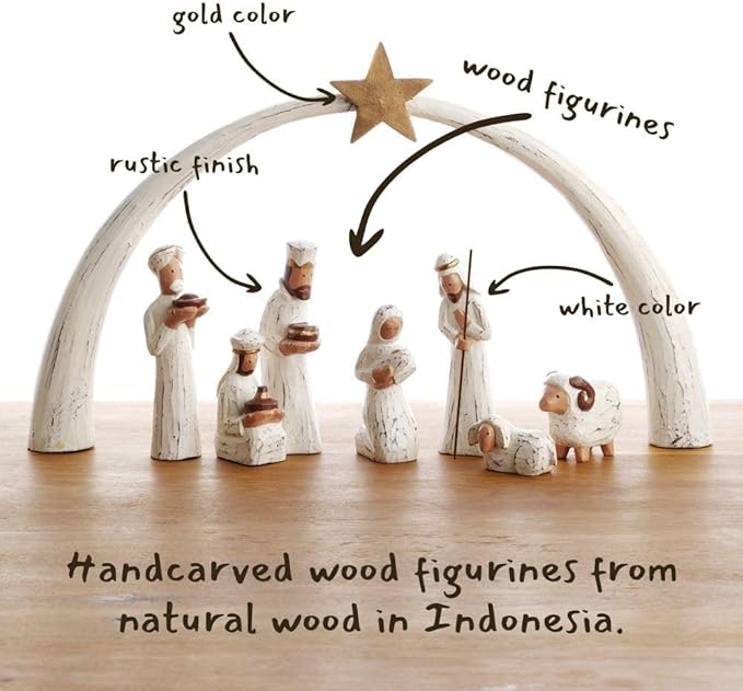 - HANDCRAFTED DESIGN: Beautiful white-finished wood nativity set featuring rustic distressed details and simple, elegant figurines arranged under a graceful arched star. These pieces are hand carved by artisans in Indonesia
