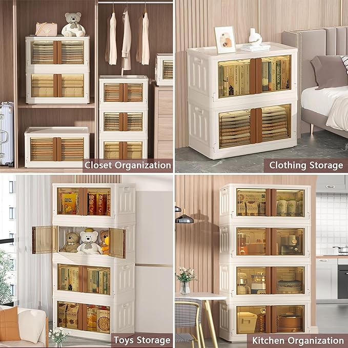 19Gal Collapsible Storage Bins with Lids & Wheels - 4 Pack Stackable with Doors, Heavy-Duty Plastic Cabinet for Home/Office, Milk White