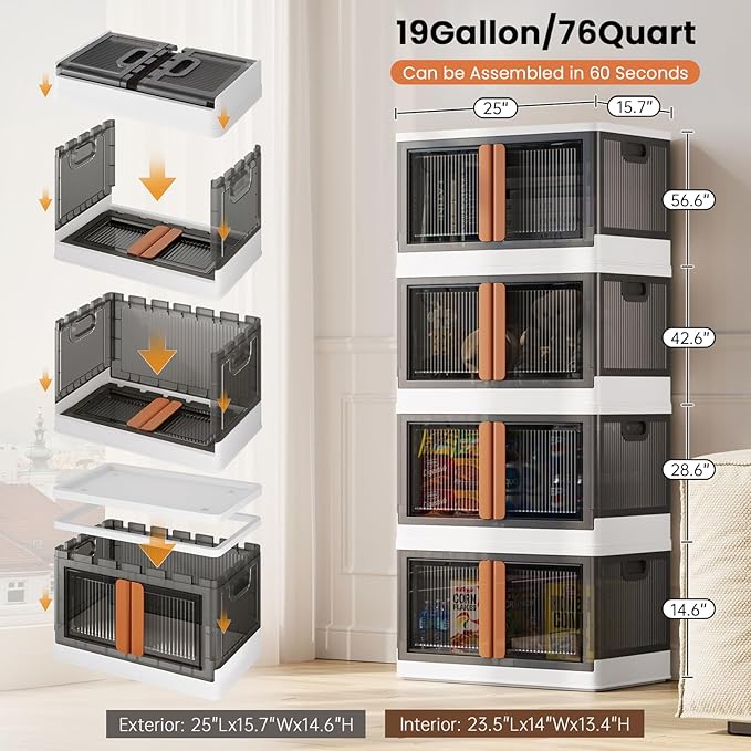 19Gal Collapsible Storage Bins with Lids & Wheels - 4 Pack Stackable with Doors, Heavy-Duty Plastic Containers for Home/Office, White