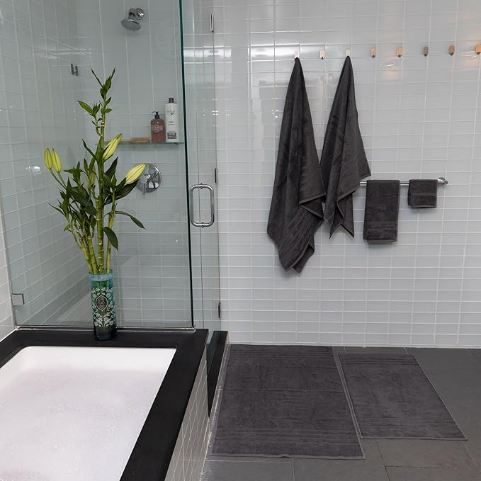 - Towels: 50% Viscose Made From Bamboo & 50% Aegean Turkish Combed Cotton, 700 GSM / Bath Mats: 55% Viscose Made From Bamboo & 45% Aegean Turkish Combed Cotton, 1000 GSM – Carefully crafted with optimal weight and thickness to soak up water and comfort your skin. Double twisted yarns are spun out of extra-long fibers to ensure superior quality and performance. Buy individually or in Family Multi-Packs.
