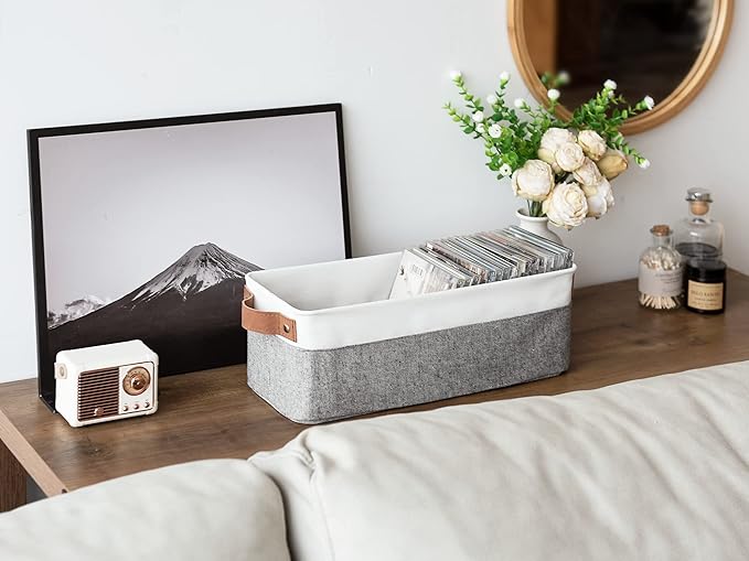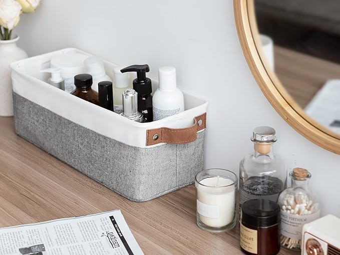 StorageWorks Narrow Storage Bins, Small Basket for Closet and Shelves, Fabric Organizer with Handles, Toilet Paper Storage, Grey and White, 2-Pack