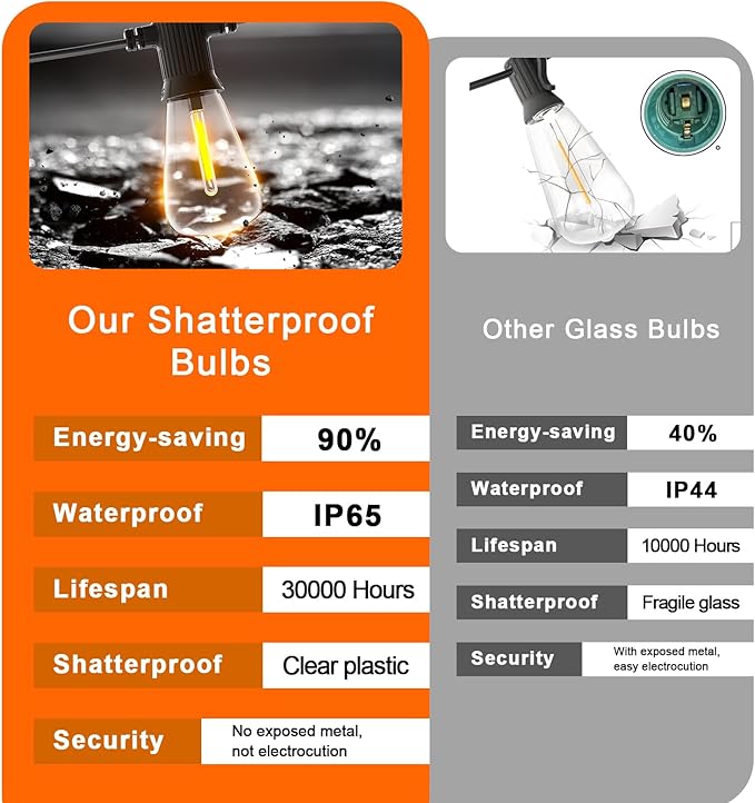 - SHATTERPROOF ST38 RETRO STRING LIGHTS: Our Edison string lights are crafted from thick, durable modern plastics, making the bulbs virtually unbreakable and capable of withstanding extreme temperatures without burning out. This advanced material, combined with a special manufacturing process, ensures superior light transmission, offering a perfect and resilient alternative to traditional glass bulbs.