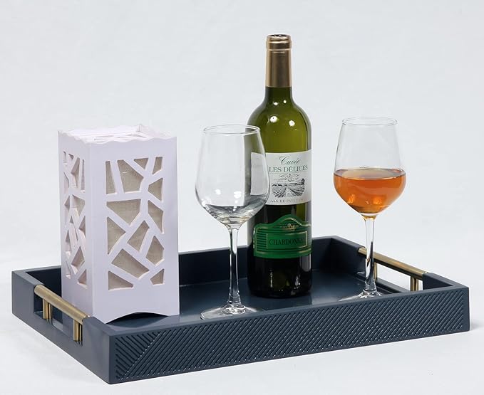 Serving Tray with Polished Metal Handles, 16.5''x12'' Rectangle Coffee Table Tray, Modern Decorative Tray, Large Ottoman Tray, Perfect for Storage and Display (Blue)