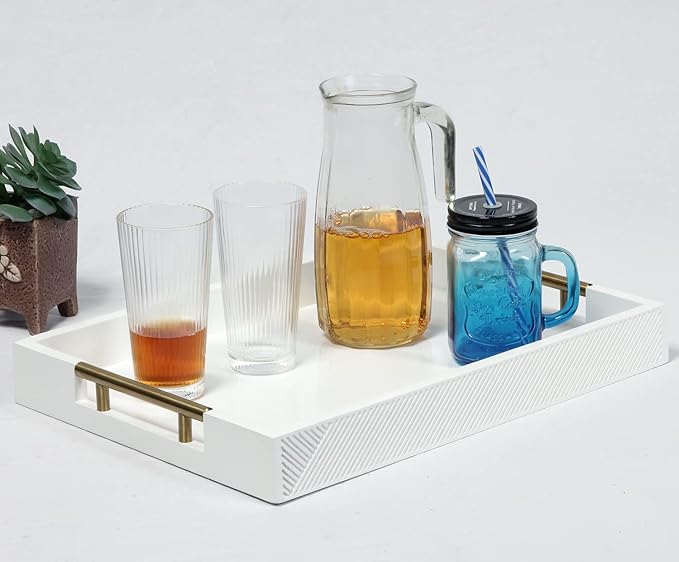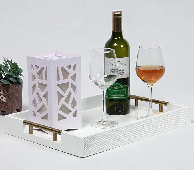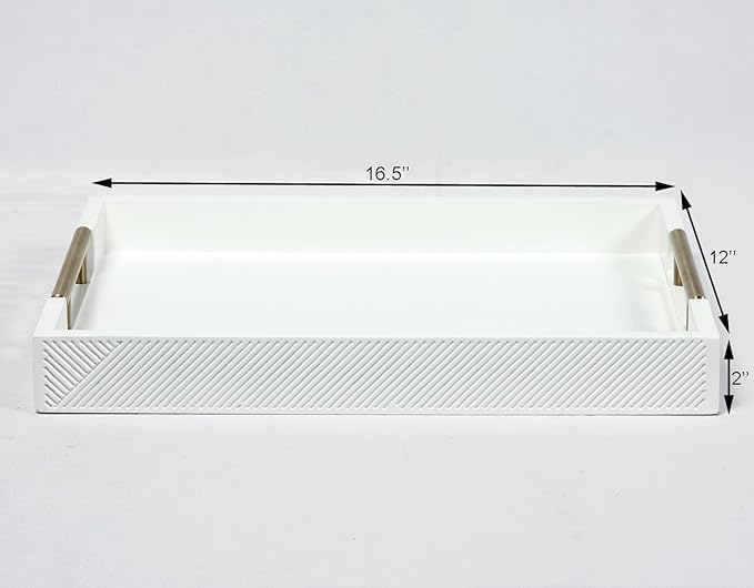 Serving Tray with Polished Metal Handles, 16.5''x12'' Rectangle Coffee Table Tray, Modern Decorative Tray, Large Ottoman Tray, Perfect for Storage and Display (White)