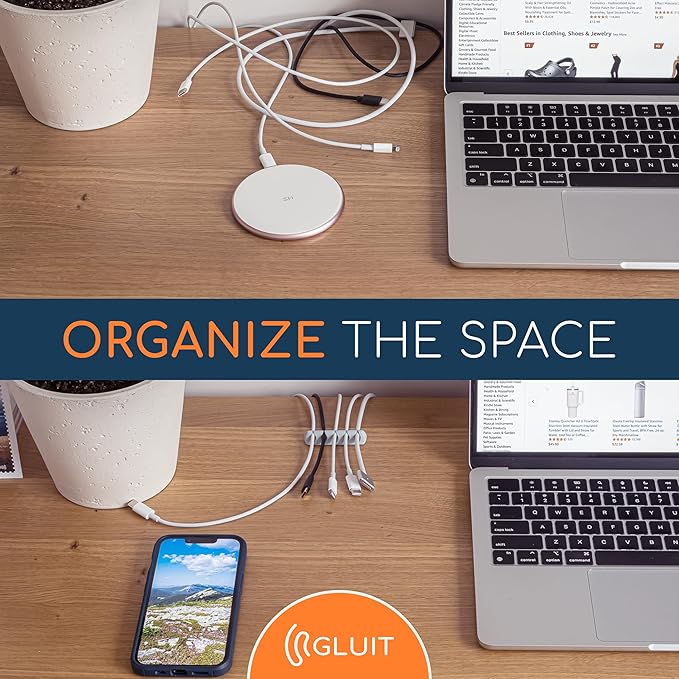 - Secure Cord Holders: GLUIT's dependable cord holders firmly secure cables, preventing slippage or loss. These organizers foster a neat, productive workspace for enhanced focus. Keep your cables organized on any surface with our easy-to-use, adhesive-backed wire clips. These clips are perfect for securing cords, chargers, headphones, and more