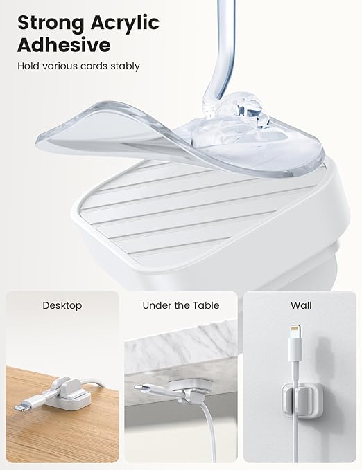- No-Residue Acrylic Adhesive: This cable organizer comes with a strong Acrylic adhesive tape that can tightly adhere to any clean surfaces. Clear removable stickers will not damage your desktop, wall. And replaceable stickers will help you change location easily