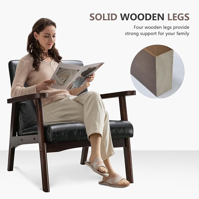 Bonzy Home Accent Chair - Faux Leather Mid Century Modern Chair for Living Room | Sturdy Solid Wood Frame Armchair, Comfy Retro Chair for Bedroom & Small Spaces, Accent Chairs, Black