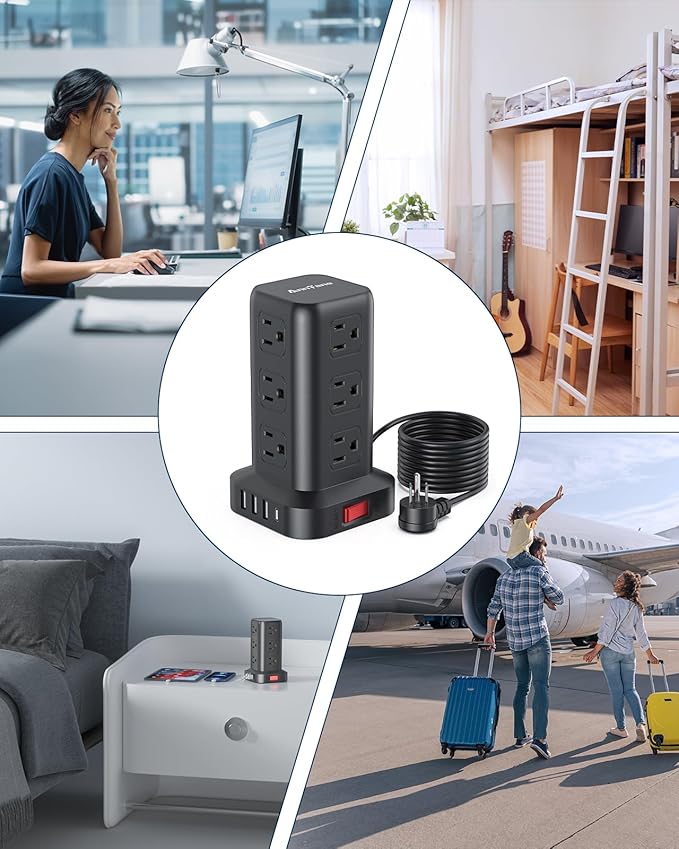 - Safe and Reliable Power Tower: To protect you and your valuable electric equipment, this power strip tower adopts advanced protection technology and has passed FCC, RoHS safety certification, with surge protection, overload protection, lightning protection and short-circuit protection. Major components such as extension cords 10 ft are safely.