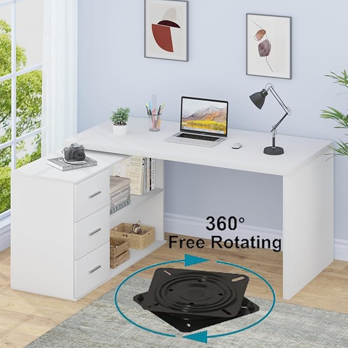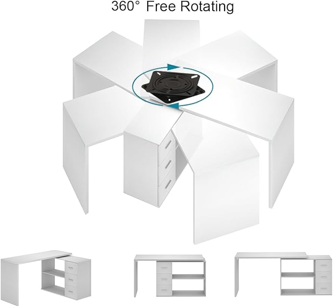 - 【Real 360° Rotating Desk 】: Our HSH rotating l shaped desk comes with a high-quality turntable which can make it rotate smoothly and easily. Depending on how your space is arranged, this white l shaped desk with drawers can be configured in any degree you like, which means it can be rotated randomly.