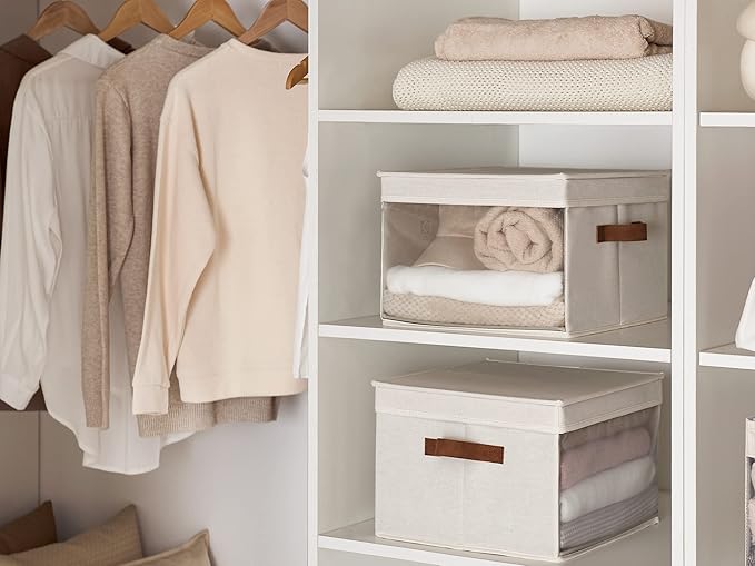 StorageWorks Storage Bins with Lid and Clear Window, Fabric Storage Boxes with Lids, Stackable Basket for Shelves, Closet Organizer and Storage Bins, Beige, Large, 4-Pack