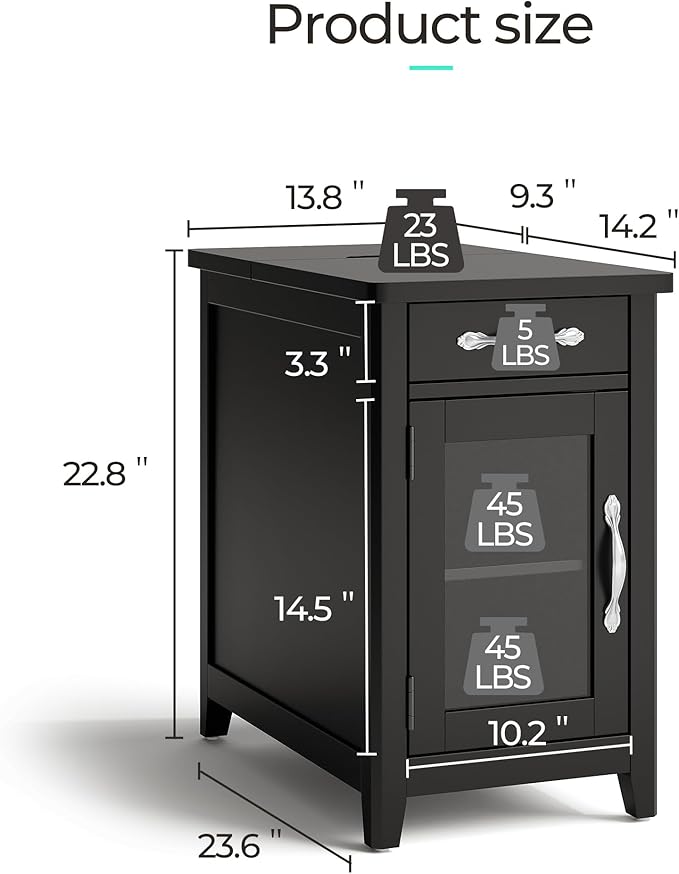 - Side Table with Versatility - Measuring 23.6''Dx 13.8''Wx22.8''H. Come with storage shelf with door and extra display space from the back shelf. Support max weight of 118 lbs in total, this nightstand is a sturdy and reliable choice for any bedroom.