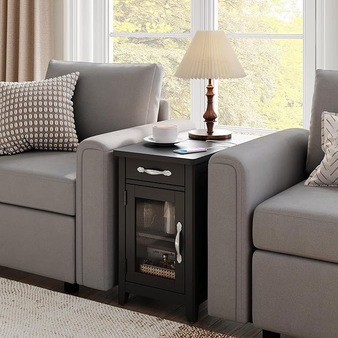 LINSY HOME End Table with Charging Station, Side Table for Bedroom with Drawer and Detachable Holder, Storage Shelf with Glass Door, Extra Storage & Display Space, Small Nightstand for Living Room