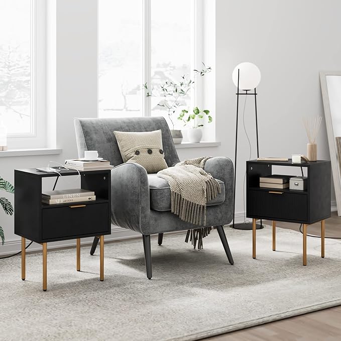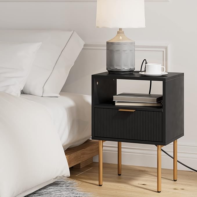 Masupu Nightstand with Charging Station,Mid-Century Modern Bedside Table with Storage Drawer and Open Wood Shelf,Small Gold Frame Side Table for Bedroom,Living Room (Black)