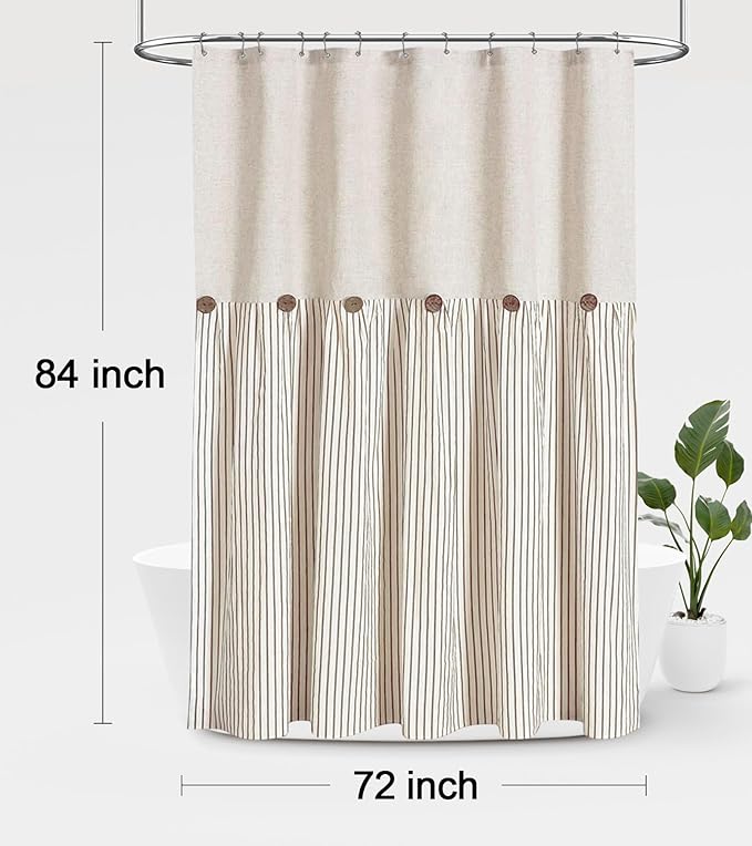 Awellife Farmhouse Beige Shower Curtain Button Linen Textured Woven Fabric,Pleated Beige Stripe,Country Style,72" W x 84" L