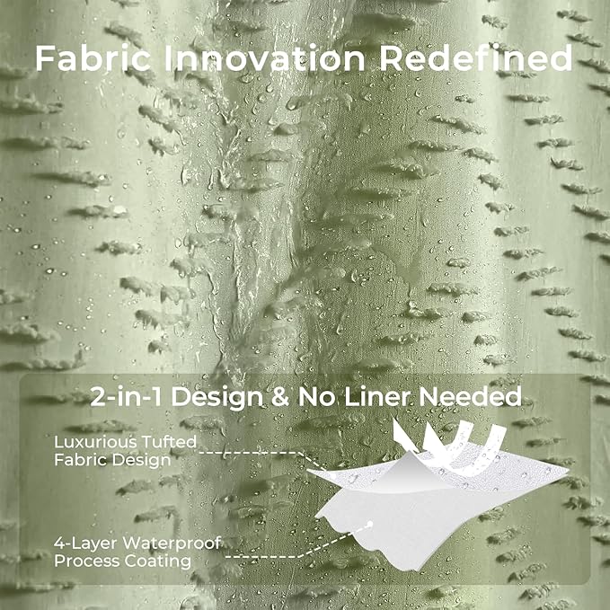 - 【Green Textured Double Layer Waterproof Shower Curtain】- This Tufted Shower Curtain Adopted Double layers Fabric,Ultra-textured.Back waterproof TPU fabric which is expertly chosen, touches soft and ccomfortable. Our shower curtains are machine washable, which makes cleaning them easy, convenient, and hassle-free.This great quality water resistant shower curtain is definitely worth the price, you won't regret it!
