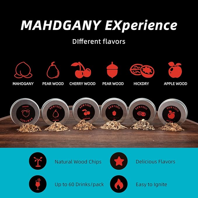 - 【6 Flavors Bring More Experience】 Our cocktail smoker kit is different from other products, with a variety of choices and richness. There are 6 different flavors of wood chips so that you can keep trying new flavors. After being smoked with different flavors of wood chips, the wine will have a more layered aroma, allowing you to better experience the beauty of smoking, making the process of making smokers' drinks a pleasure!