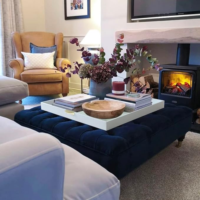 - This tray organizer is made of elegant faux leather, mdf, velvet, and the dimension: 23.6 x 23.6 x 2 inches.Perfect size for as serving tray, decorative tray, ottoman tray and more.