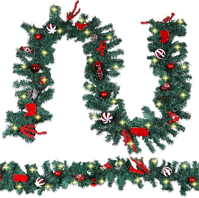 MorTime 2 Pack 9 FT LED Christmas Garland with Pinecones Red Berries Bows Christmas Balls Candies, Multi-Function Christmas Garland with 50 Warm White LED Lights, 180 Branch Tips