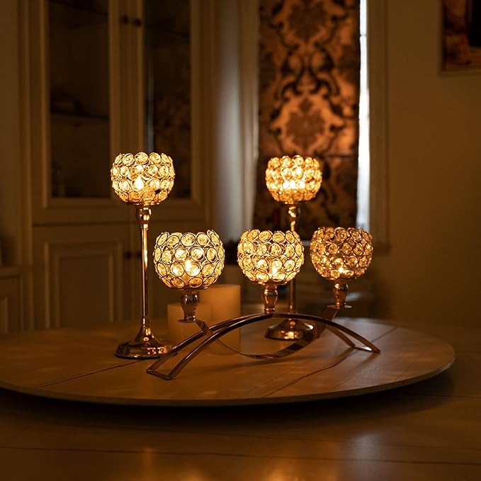 - 【Extremely large crystal ball to accommodate more convenient candle placement】➢➣➤ Each globe measures 4" wide rather than 3" wide in market,The inner plate measures 2 1/4" diameter, so 2" candles fit perfectly. From the end of one globe to the next globe, measures 14", and the base is 16 1/4" by 3 1/8".This gold crystal candle holder is perfect for home or wedding, it's an elegant arch design with padded legs, so it won't scratch whatever surface you put it on.