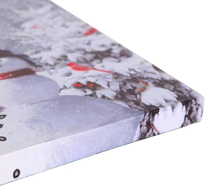 - 【Lighted Red Barn House】- Snow-covered road, Christmas tree, snowman and red barn house accents adorn this beautiful Christmas art. This light-up snowy winter scene will brighten up your home and creates a Christmas atmosphere