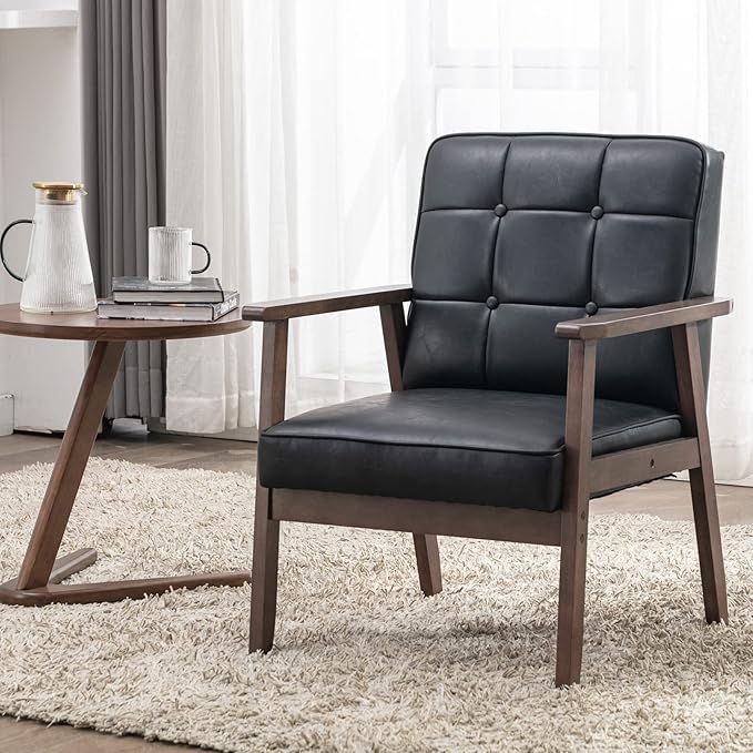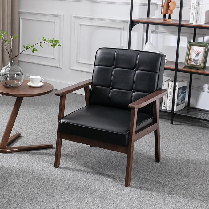 Okeysen Mid Century Modern Accent Chair, Retro Wood and Leather Armchairs Side Chair, Lounge Reading Comfy Arm Chair for Living Room, Bedroom, Office (Matte Black)