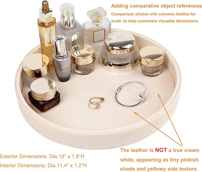 - CreamWhite Round Tray with Peachy color, Size: 12 inch diameter x 1.6 inch height. The tray is covered with classic croco faux leather material, durable and eco-friendly, add a beautiful touch to any room. PLEASE NOTE: This leather is not a true / complete cream white, appearing as tiny pinkish shade and yellowy side texture. Refer to the enlarged detail image.