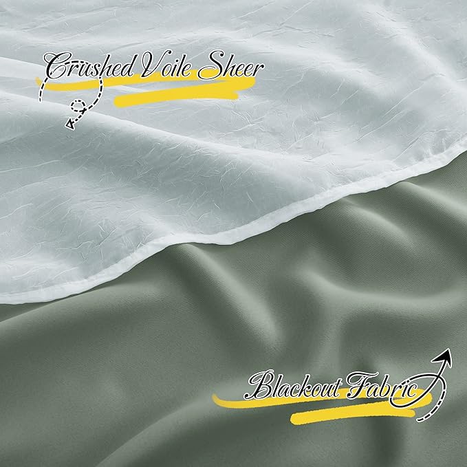 - ELEGANT STYLISH: Innovative blackout fabric provides maximum privacy while a crinkled sheer panel brings an airy look. Both layers come with a tie back for different styling.