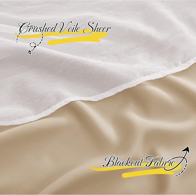 - ELEGANT STYLISH: Innovative blackout fabric provides maximum privacy while a crinkled sheer panel brings an airy look. Both layers come with a tie back for different styling.