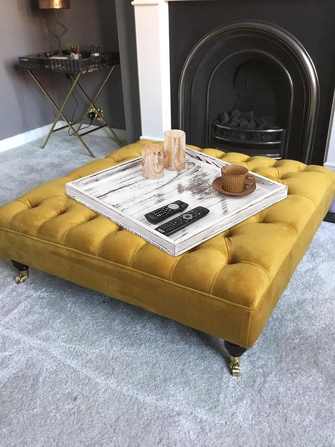 Extra Large Square Ottoman Table Tray 20" - Rustic Wooden Serving Tray for Farmhouse Decorative Oversized Coffee Table Trays Living Room Kitchen Counter Breakfast White