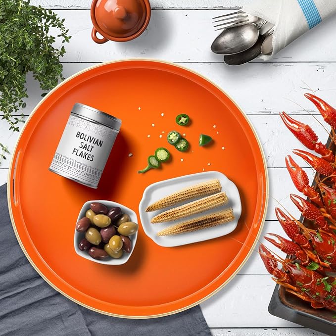Orange Round Decorative Tray with Handles, 13" Versatile Serving Tray for Coffee Table, Ottoman, Ideal for Serving, Displaying, Organizing
