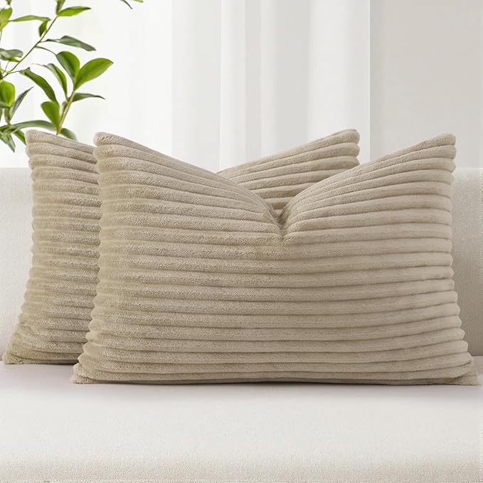 Simmore Decorative Fall Throw Pillow Covers 12x20 Set of 2, Soft Natural Plush Flannel Double-Sided Fluffy Lumbar Pillow Covers for Couch Sofa Living Room, Khaki