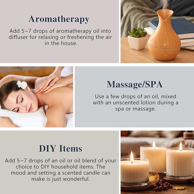 - 【Multiple Uses】These essential oils can be used for aromatherapy, diffuser, massage, skin & hair care. Simply add a few drops to any diffuser and fill your entire room with that aroma, suitable for home care (large room, bedroom, living room, bathroom), office, outdoors, campground, yoga room and spa for a whole day relaxation.