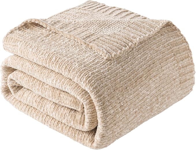 BATTILO HOME Knit Chenille Throw Blanket for Couch, Cozy Beige Throw Blankets for Home Decor,Lightweight Soft Throw for Bed,Sofa,Chair 51"x67"