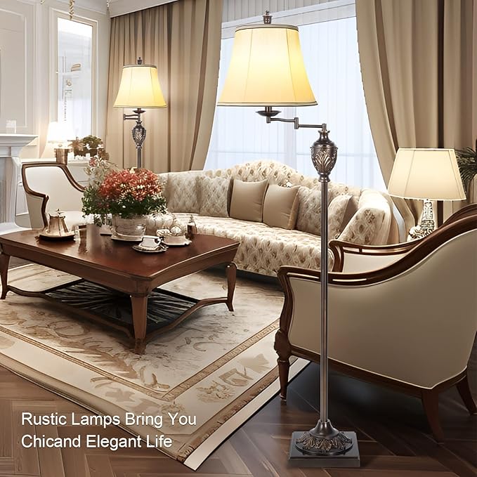 Traditional LED Floor Lamp with 350° Adjustable Swing Arm Lamp – Vintage Standing Pole lamp for Living Room, Bedroom and Office – Rustic Upright Floor Light for Home Décor with Faux Silk Fabric Shade